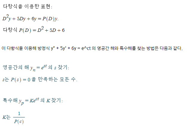 방정식 y" + 5y' + 6y = e^ct 를 다른 관점에서 바라보자. 방정식의 좌변에 있는 미분인자 d/dt 를 D로 표기하면 다음과 같이 표현 가능하다.