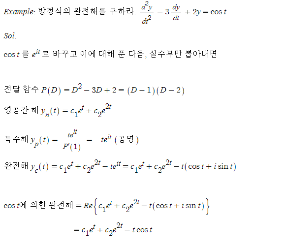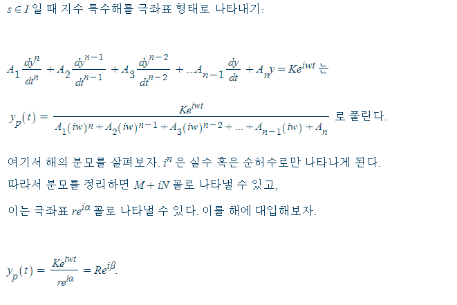 입력 q(t) 가 사인 형태나 코사인 형태일때 특수해는 어떻게 구할까? y_p(t) = Acoswt + Bsinwt 로 두고 방정식을 풀어도 해를 얻을 수 있지만, 오일러 공식을 이용하여 푸는 것이 훨씬 빠르고 간편하다. 일차 미분방정식을 배울 때와 같이 실수 - 복소수 - 실수 세 단계를 거쳐 해를 구한다. 만약 공명이 나와도 쫄지 말고 배운 대로 하면 된다.
