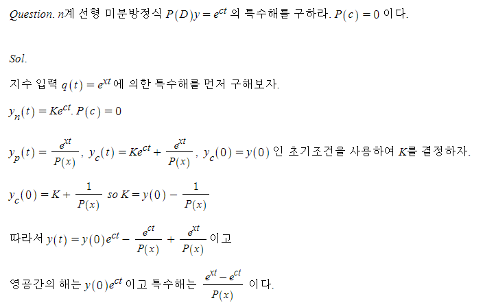 특수해 풀이방법에 집중하자. 분수 K = 1 / P(c) 는 입력 q(t) = Ke^ct 를 출력 y_p = e^ct / P(c) 로 "전달"한다.