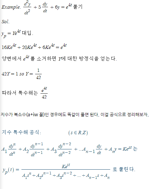 예시를 들며 시작하자. 방정식 y" + 5y' + 6y = e^4t 의 특수해는 어떻게 구할 것인가? 방정식의 우변이 지수함수 e^4t 이므로 해 y 는 e^4t 와 상수의 곱 형태일 것이다. y_particial = Ke^4t 로 두고 방정식에 대입해 보면