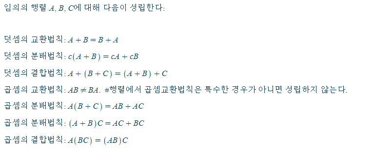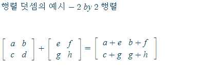 행렬끼리의 덧셈은 다음과 같이 정의된다: 행과 열의 개수가 같은 두 행렬 A, B에 대해 그 합 A+B 는 위치가 동일한 각 원소들의 합으로 정의된다.