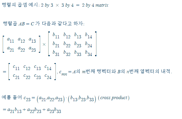 열의 개수와 행의 개수가 같은 두 행렬 A, B가 있을 때 곱 AB 를 정의할수 있고 행렬 AB의 m행 n열 원소는 A의 m번째 행벡터와 B의 n번째 열벡터의 내적과 같다. 또한 AB의 행의 개수는 A의 행의 개수와 같고 열의 개수는 B의 열의 개수와 같다.