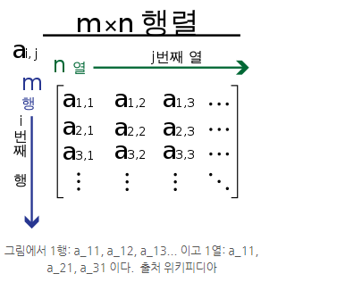 수학에서 행렬이란 수, 문자, 함수를 괄호 안에 직사각형 형태로 배열한 것이다. 이때 각 성분들을 행렬의 원소(element)라 하며, 가로줄을 행(row), 세로줄을 열(column) 이라고 한다. 또한 m행 n열의 원소를 아래첨자를 사용하여 a_m,n 이라 표현한다.
