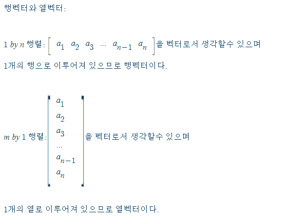마지막으로, 1개의 행 혹은 1개의 열로만 이루어진 행렬을 벡터로 보아 각각 행벡터 혹은 열벡터로서 보기도 한다.