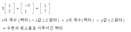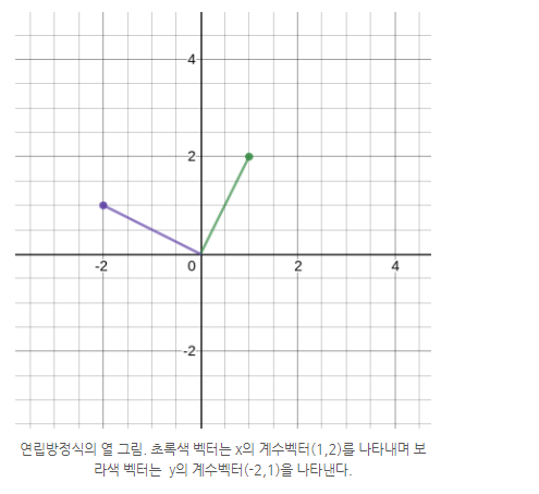 x의 계수벡터 A = (1,2)의 합과 y의 계수벡터 B = (-2,1)을 올바르게 선형결합하면 (xA + yB) 방정식의 우변을 원소로 가지는 벡터 (1,7)을 얻을 수 있을 것이며 상수쌍 (x, y)는 단 하나만 존재함을 알 수 있다. ("선형" 연립방정식을 풀고 있기 때문이다.)이때 각 계수벡터 A, B 가 서로 독립적임이 중요하다.