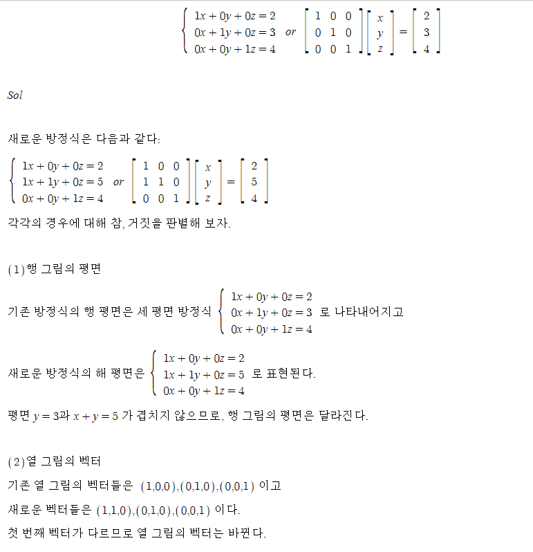 위에서 얘기한 "연립방정식의 행렬 표현" 을 보면, x성분은 계수행렬의 첫번째 열벡터와, y성분은 계수행렬의 두번째 열벡터와 연산됨을 알 수 있다. 따라서 연립방정식의 행렬 표현이 올바른 풀이를 나타낸다는 것을 알 수 있다.