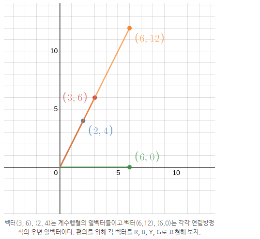 계수행렬의 열벡터들(그림에서 R, B)을 임의로 선형결합하여(aR + bB) 구하고자 하는 연립방정식의 우변 열벡터(각각 Y, G)를 얻는 상수 계수(a, b)를 찾아서 풀었다. 이제 두 가지 연립방정식에 대해 열 그림을 해석해 보면 다음과 같다.