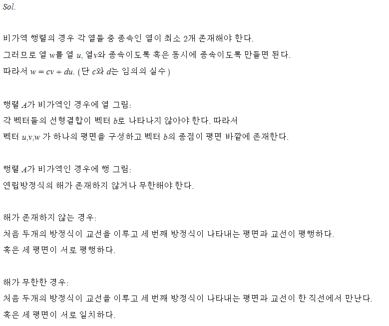 (4.1절 연습문제 29번)u와 v가 3X3 행렬 A의 처음 두 열 이라고 하자. 행렬을 비가역 행렬로 만드는 세 번째 열 w는 무엇인가? 비가역인 경우에 Ax = b 의 일반적인 열 그림과 행 그림을 설명하라.(단 b는 임의의 열벡터)