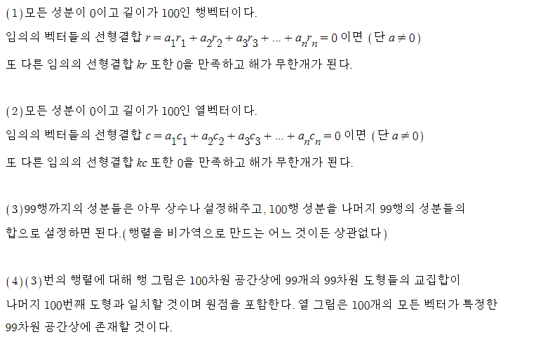 다음 물음에 답하라: (1)주어진 시스템에서 임의의 100개의 행들의 선형결합은 무엇인가? (2)해당 시스템은 무수히 많은 해를 가진다. 이때 100개의 열들의 선형결합은 무엇인가? (3)0을 성분으로 가지지 않는 100차 정방행렬을 만들어라. 그 행렬에 대해 Av = 0의 행 그림과 열 그림을 말로 설명하라.