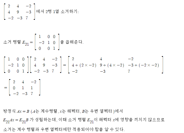 이러한 원리를 사용해 원하는 소거를 작용시키는 소거 행렬을 찾을 수 있다. n차 정방행렬의 x행에 상수 c를 곱한 후 y행에 더해주어 소거하는 행렬 P는 다음과 같다: