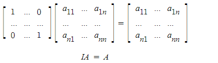 좌변의 k행 성분들은 I의 k행에 A의 모든 열들을 내적하여 나타난다. I의 k행 원소들은 k열 원소가 1이고 나머지 원소들이 0이므로 결국 A 각 열들의 k행 성분들만 남기게 되고, 결과적으로 모든 행들이 기존 행렬과 똑같이 나온다.