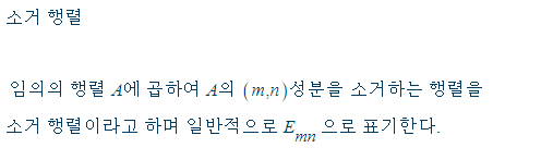 n차 정방행렬의 x행에 상수 c를 곱한 후 y행에 더해주어 소거하는 행렬을 찾아야 하는데, 이를 찾기 위해 행렬 곱셈 매커니즘을 알아야 한다. 행렬곱 EA 에서 y행 성분들은 E의 y행에 A의 모든 열들을 내적하여 나타난다. 그러므로 소거 행렬 E의 y행 n열 성분은 A의 n행에 작용하여 그 값들을 A의 y행 성분들에 더해준다. 이러한 이유로 인해 단위행렬은 주대각선이 1, 다른 원소들이 0인 행렬인 것이다. (행렬곱 IA = A 가 되려면 단위행렬의 y행이 A의 y행에만 작용하고 나머지를 0을 만들어야 하므로 y행의 y열 성분이 1이고 나머지는 0인 것)