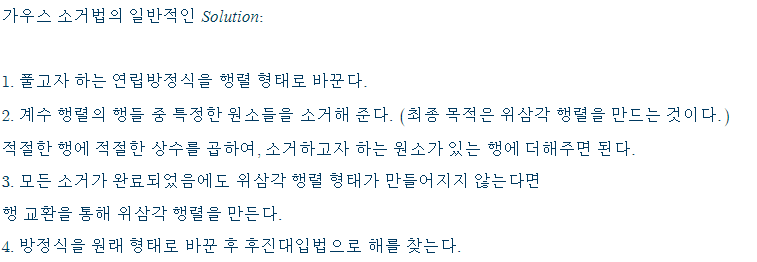 저번 포스트에서 공부한 가우스 소거법을 요약해 보자면 다음과 같다.