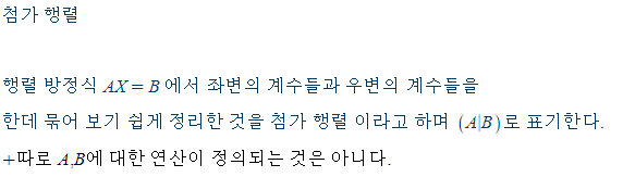 여기서 B = I 로 두면 X는 A의 역행렬이다. 가우스 - 조던 소거법은 이 아이디어를 사용하여 역행렬 A^-1 을 찾는다.