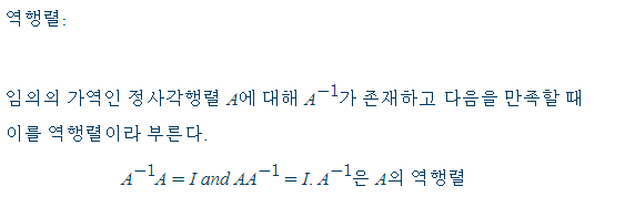 임의의 가역인 정사각행렬 A가 있을 때, AX = XA = I 를 만족하는 행렬 X를 A의 역행렬(inverse matrix)이라 부르며 A^-1 이라 표현한다.