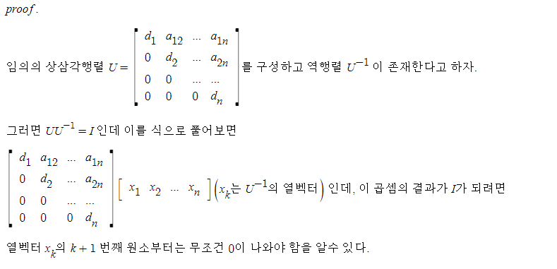 성질 9: 상삼각행렬의 역행렬을 구하는 연산이 가능하다면 이는 상삼각행렬 집합에 대해 닫혀 있다. 즉 상삼각행렬의 역행렬은 상삼각행렬이며 하삼각행렬에 대해서도 마찬가지이다.