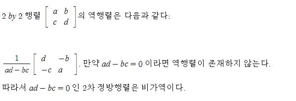 성질 5: 2 by 2 행렬이 가역인 것과 ad - bc 가 0이 아님은 동치이다.