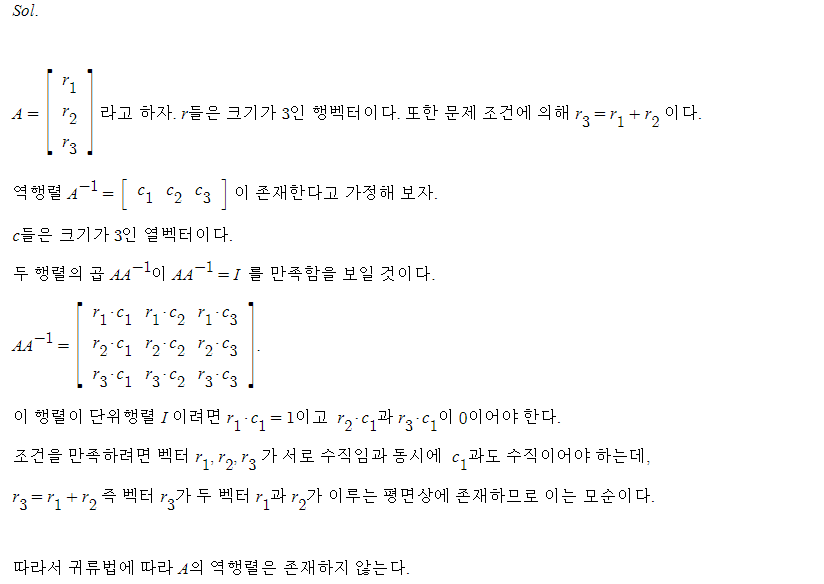 (4.4절 연습문제 07번)3차 정방행렬 A가 1행 + 2행 = 3행 을 만족할 때 A가 비가역 행렬임을 보여라.
