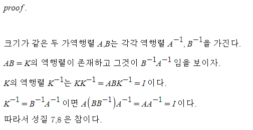*참고로 ABC의 역행렬은 C^-1 B^-1 A^-1 이고 같은 방법으로 증명 가능하다.