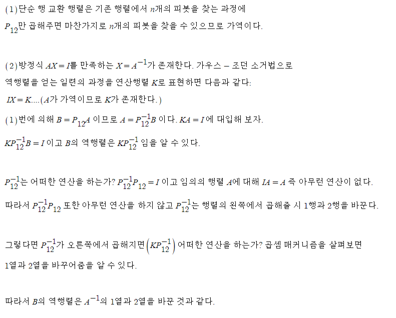 저번 포스트에서 언급했듯이, 계수 행렬 A가 가역이면 방정식 Ax = b 는 유일한 해를 가진다. 그 해를 역행렬을 사용하여 표현한 것이 x = A^-1 b 인데, 방정식의 유일한 해가 존재하므로 가우스 소거법에서 행렬 A가 가역이며, 소거법이 n개의 피봇을 찾아야 한다. 또한 역행렬을 사용한 풀이에서도 해 x는 가우스 소거법으로 도출된 해와 같아야 하므로 역행렬 A^-1 는 존재하며, 유일함을 알 수 있다.