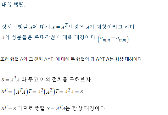 대칭 행렬(symmetric matrix) 이란 전치 행렬이 원래 행렬과 같은 행렬을 말한다. 즉 A = A^T 이며 정사각행렬이다. 또한 행렬 A는 주대각선 성분을 기준으로 대칭이다.