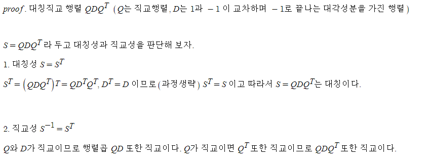 대부분의 행렬은 대칭이면 직교가 아니고 그 반대의 경우도 마찬가지이다. 다만 대칭직교 행렬의 경우 대칭이면서 동시에 직교이다. 이러한 것이 어떠한 조건 하에 성립하는지, 성립한다면 그 행렬은 어떠한 특성을 가지는지 알아본다.