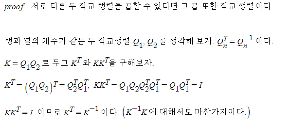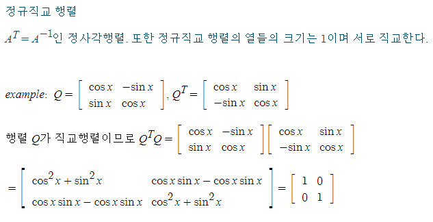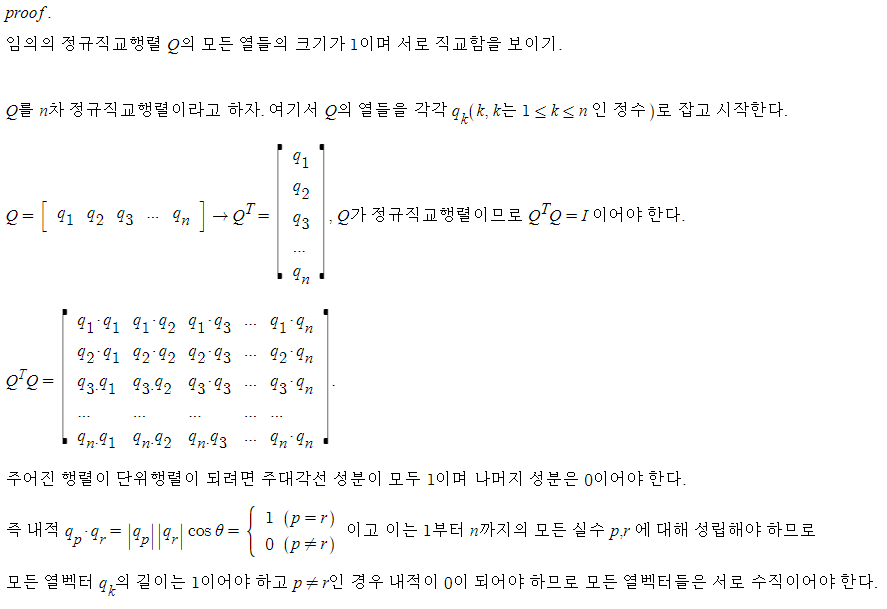 여기서 한 가지 성질을 확인할 수 있다. 행렬이 정규직교행렬일 때 행렬의 모든 열벡터의 크기는 1이며 서로 직교한다. (내적값이 0이다.) 일반적인 경우에 대해 증명은 다음과 같다: