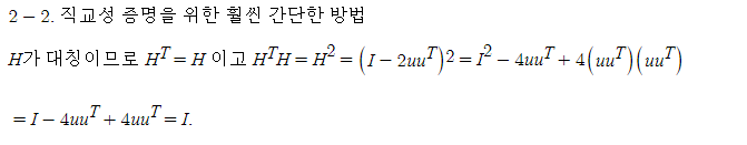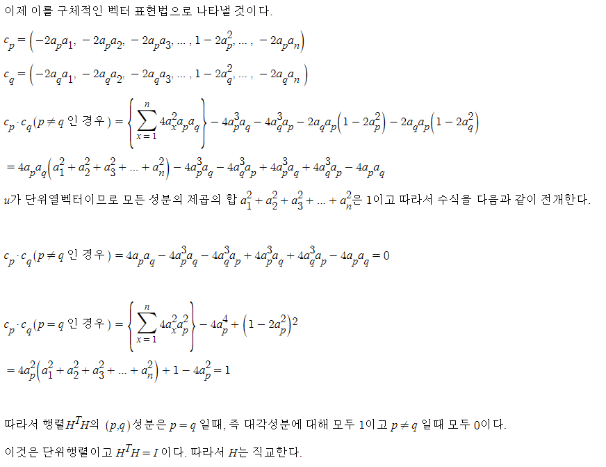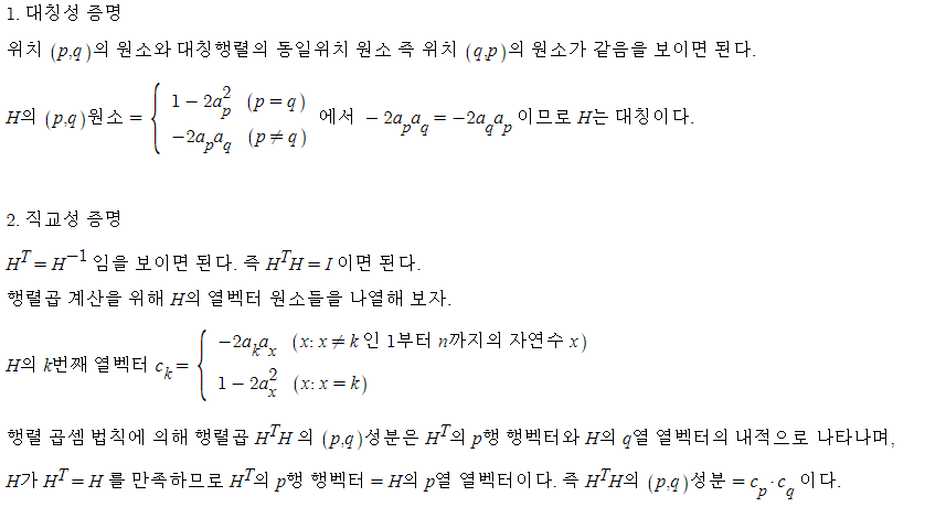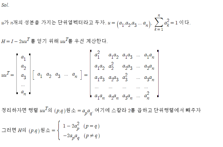 (4.5절 연습문제 22번)u가 단위 열벡터일때 행렬 H = I - 2uu^T 가 대칭직교 행렬임을 보여라.