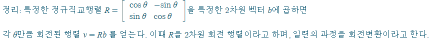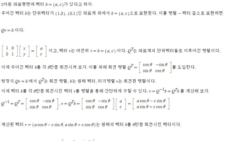 +벡터에 곱해준 행렬 R의 열들의 크기가 모두 1이므로 원래 벡터b 의 길이가 유지되며 방향만 바뀐 것을 알 수 있다. 만약 벡터의 크기또한 바구고 싶다면 R에 알맞은 스칼라배를 해 주면 된다.