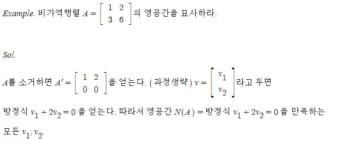 정의: 행렬 A의 영공간을 N(A)로 표시하며 방정식 Av = 0 의 모든 해 v의 집합을 의미한다. 행렬이 n개의 열을 가질 때, N(A) 는 R^n의 원소이다.