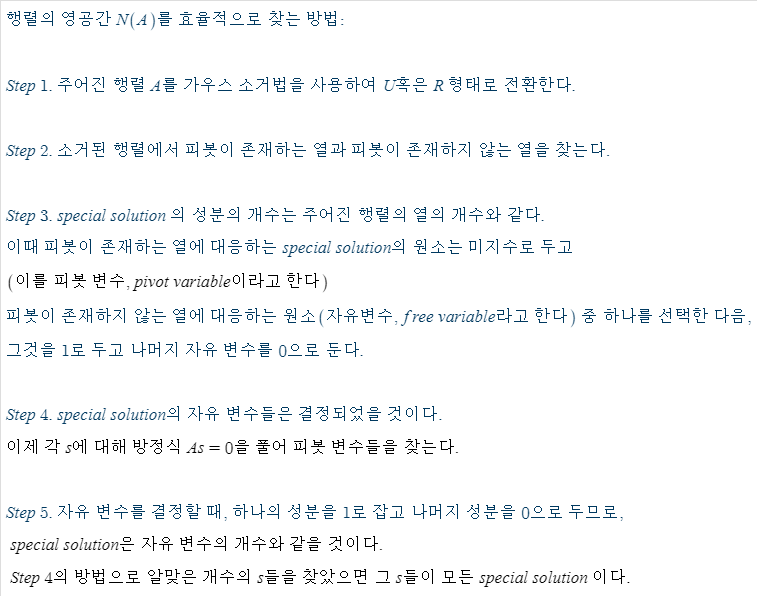 이제 방정식의 알맞은 special solution을 찾을 수 있다. 이를 통해 행렬의 영공간을 효율적으로 찾을수 있으며. 일반적인 방법을 공부하고 몇 가지 예시를 확인한다.