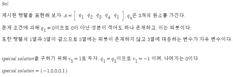 (5.2절 연습문제 14번)3X5 행렬의 첫번째 열과 마지막 열이 같다.(단 영벡터는 아니다) 확실한 자유 변수와 그에 대한 special solution 을 구하라.