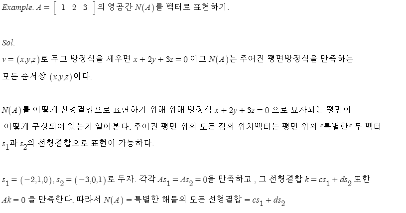 행렬의 영공간 N(A)는 방정식 Av = 0의 special solution들의 임의의 선형결합으로 표현된다. 영공간의 정의로부터 N(A)내부의 모든 벡터는 방정식 Av = 0을 푼다.