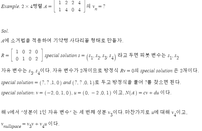 영공간 해 v_n을 표현하는 방법은 간단하다. 방정식의 special solution이 u와 v이면, N(A) = cv + du 이다. 단순히 상수 c와 v만 적절한 변수로 바꾸어주면 된다.