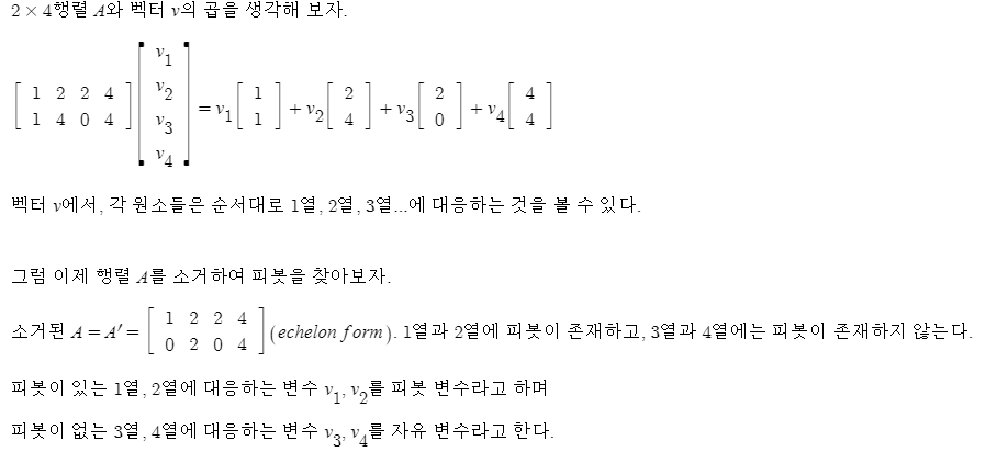 자유 변수(free variable)와 피봇 변수(pivot variable)는 행렬의 영공간을 벡터의 선형결합 형태로 나타내는 데 있어 매우 중요한 개념들이다. 행렬 - 벡터 곱 Av의 계산과정으로 시작한다.