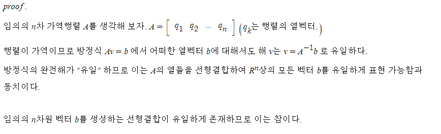 마찬가지로 명제의 참 거짓을 판단하기 위해 행렬 - 벡터 곱으로 표현하면 주어진 행렬의 모든 열이 피봇 열이고(rank(A) = n), 이로부터 열벡터들의 선형결합으로 영벡터를 만드는 방법은 모든 스칼라가 0일 때로 유일함을 알 수 있다. 또한 정사각행렬의 모든 열들이 독립이면, 이는 가역행렬이다.