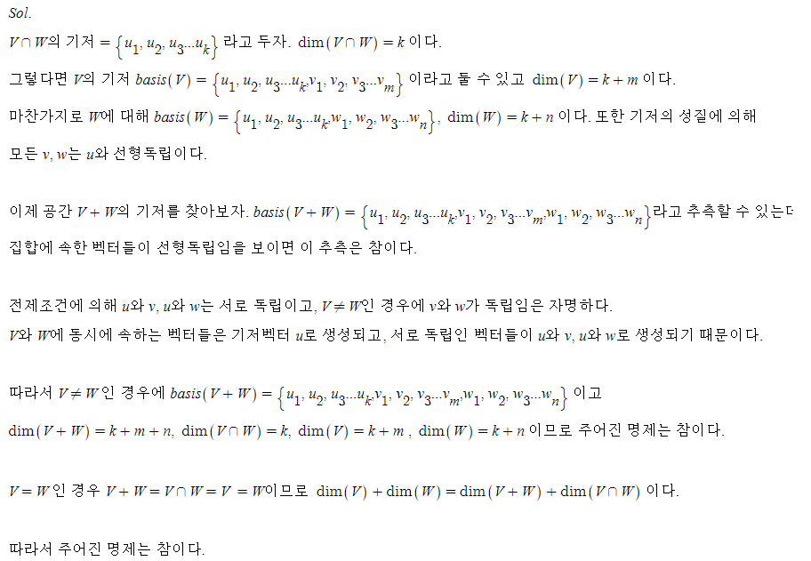 (5.4절 연습문제 38번)임의의 두 부분공간 V, W에 대해 dim(V) + dim(W) = dim(V intersection W) + dim(V + W) 가 성립함을 증명하라. (intersection은 교집합을 의미한다.)