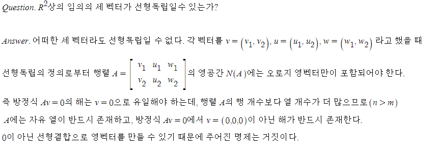 1. n > m을 만족하는 두 자연수 m, n에 대해 R^m 상의 임의의 n개의 벡터는 선형종속이다.