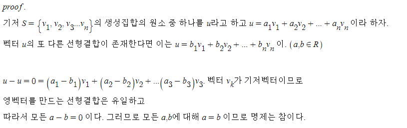 정의로부터 도출되는 정리 1: 생성된 공간 내부의 임의의 벡터 u를 기저에 속한 벡터들의 선형결합으로 쓰는 방법은 유일하다.