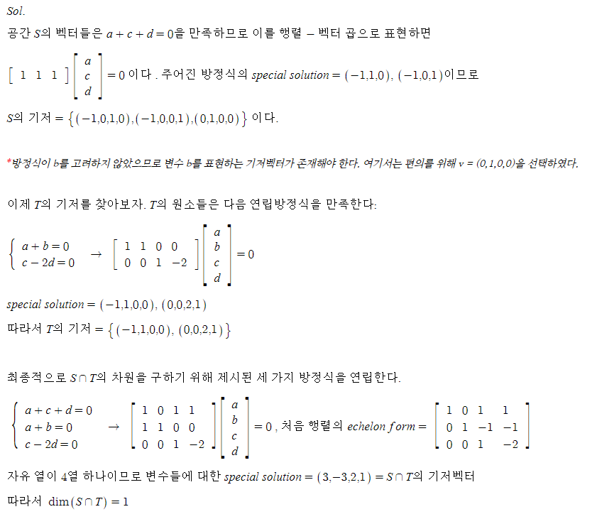 (5.4절 연습문제 33번)벡터 (a, b, c, d)중 a + c + d = 0을 만족하는 벡터들의 공간을 S, a + b = 0이고 c = 2d 를 만족하는 벡터들의 공간을 T라 하자. S와 T에 대한 기저를 찾고 S와 T의 교집합의 차원을 구하라.