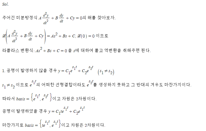 예제_함수공간: 2차 선형 미분방정식 Ad^2 y / dt^2 + Bdy / dt + Cy = 0의 해로 이루어진 공간의 기저와 차원을 구하라.