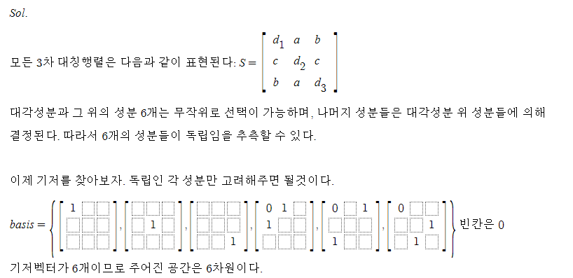 예제_행렬공간: 3X3 대칭행렬로 이루어진 공간에 대한 기저와 차원을 구해라.