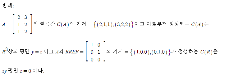 정의로부터 도출되는 정리 4: 행렬 A의 피봇 열들은 C(A)의 기저이다. 단 RREF 형태의 소거된 행렬의 피봇 열들은 일반적으로 C(A)의 기저가 아니다.