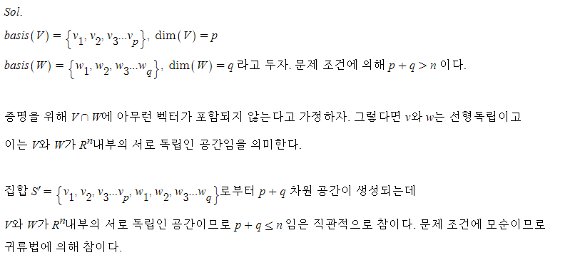 (5.4절 연습문제 39번)R^n의 두 부분공간 V, W에 대해 dim(V) + dim(W) > n을 만족할 때 V와 W 모두에 속하는 영벡터가 아닌 벡터가 존재함을 보여라.