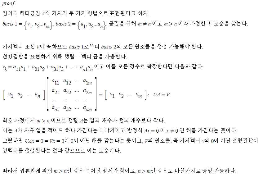 벡터공간의 차원이 위와 같이 정의되려면, 동일한 공간에 대해서 항상 같은 차원을 가짐을 증명해야 한다. 증염은 다음과 같다:
