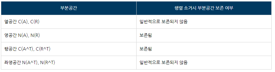 물론 특수한 행렬의 경우 원래 행렬의 좌영공간과 소거된 행렬의 좌영공간이 같을 수 있다. 다음과 같이 기억하면 된다.