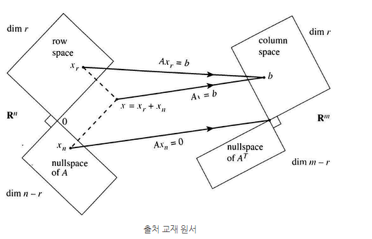 지금껏 우리가 행렬에 관해 배운 부분공간은 총 4가지로, 열공간, 영공간, 행공간, 좌영공간이다. 언급했듯이 이 네 개의 부분공간은 방정식 Av = b 에서 서로 연관되어 있으며 그림으로 나타내면 다음과 같다.