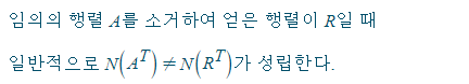 행렬을 소거하여 사다리꼴 혹은 기약행 사다리꼴로 만들었을 때 행렬의 좌영공간이 유지될까? 즉 N(A^T) = N(R^T) 인가? 유지되지 않는다 이다. 행렬 A로 반례를 들 수 있다.
