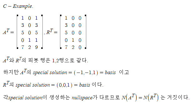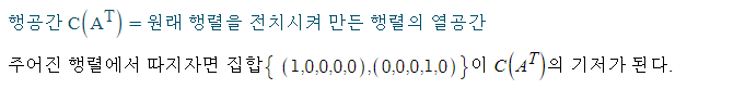 행공간의 기저는 주어진 행렬에서 피봇을 포함하고 있는 행벡터들이다. 이때 필자가 C(A^T)의 기저를 A의 행벡터가 아닌 완전히 소거된 행렬 RREF의 피봇 행벡터들로 구성한 것을 볼 수 있다. 행렬의 소거 과정이 행들의 선형결합이며, 행공간 생성 또한 행들의 선형결합으로 이루어지기 때문에 소거된 행렬에서 기저를 찾아도 무방한 것이다. 즉 A의 소거 R에 대해 C(A^T) = C(R^T) 이다.