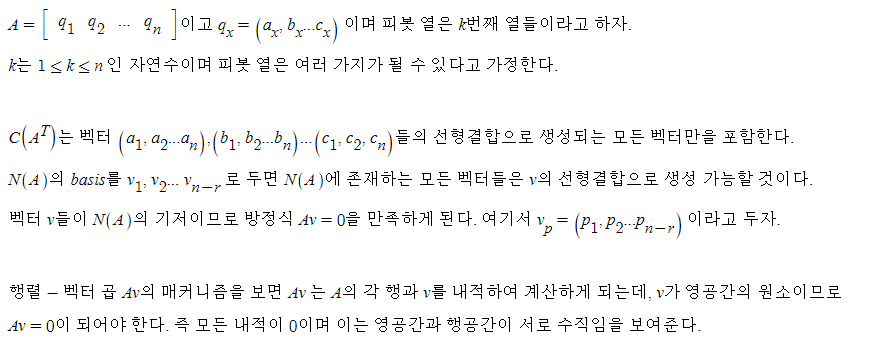 행공간에 속한 임의의 벡터와 영공간에 속한 임의의 벡터를 내적한 것이 항상 0이라고 이해하면 될것이다. 이때 정의되지 않는 변수는 0으로 계산한다. 증명은 아래와 같다: